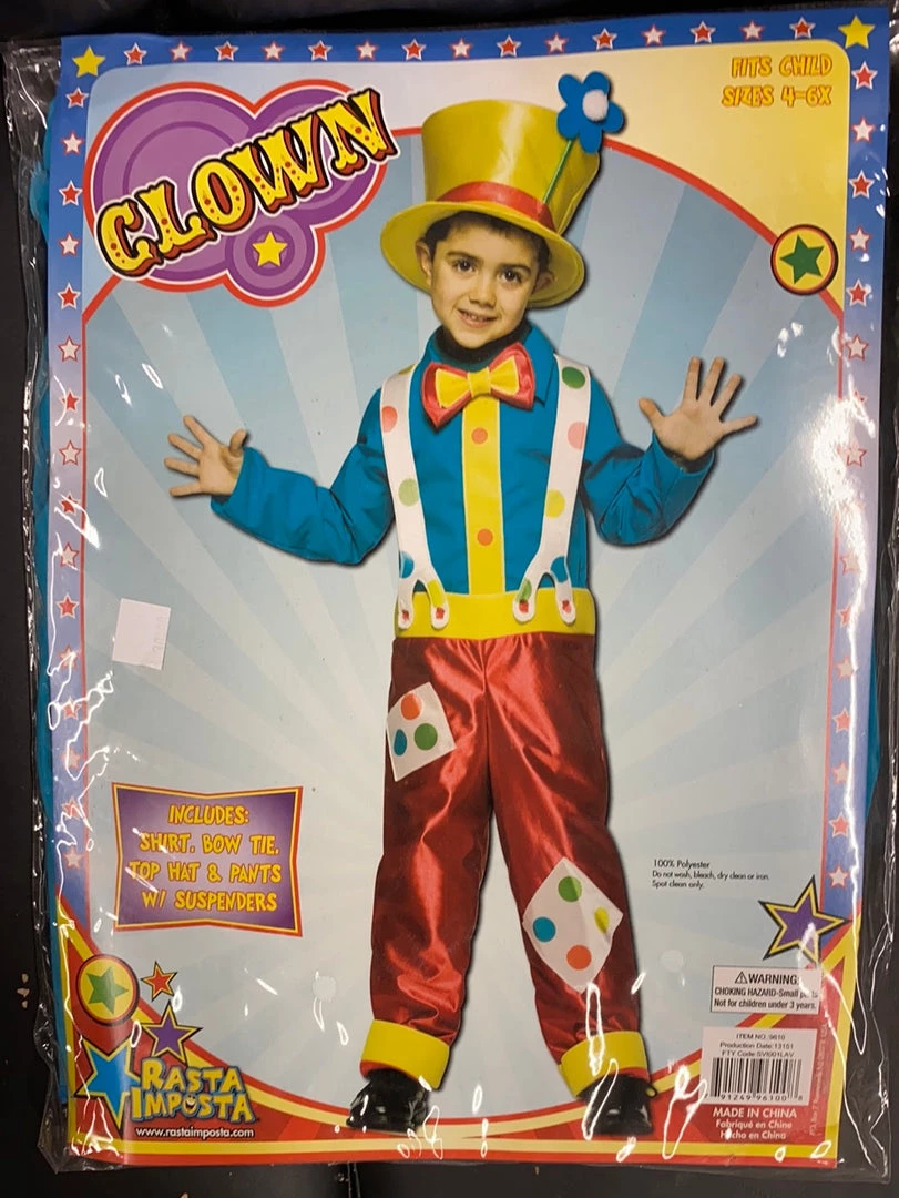 Clown costume, kids, child, shirt, bow tie, top hat, and pants with suspenders, size 4-6x