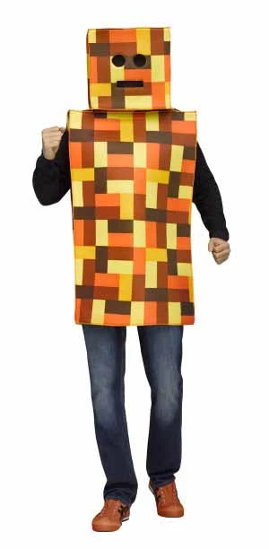 Includes block-shaped pixel patterened tunic and hood in orange tones.