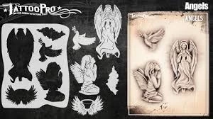 The Angels design sheet features 1 lg Angel stencil, 1 med sized Kneeling Angel stencil, 1 small Dove, 1 sm Wings & Halo, 1 small cloud and other elements that can be used to make realistic airbrush tattoos