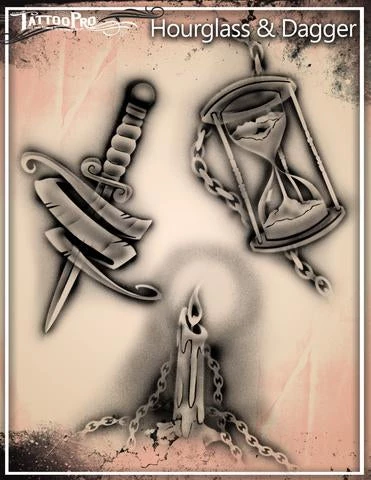 The Hourglass & Dagger design sheet features 1 Hourglass stencil, 1 Dagger stencil, 2 sizes Candle stencils, 2 sizes Chain stencils, and other elements used to create realistic airbrush tattoos.