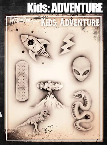 This Special Edition Kids Stencil Kit contains Various kid-sized stencil designs including, Spaceship, Alien, Snake, Volcano, Dinosaur bones, and Band-Aid!