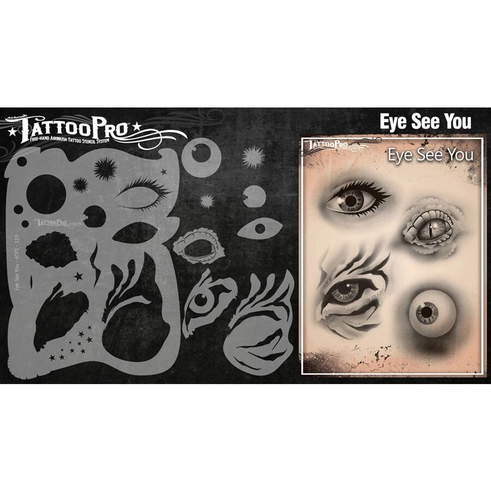 The Eye See You design sheet features 1 Human Eye stencils, 1 Tiger Eye, 1 Reptile Eye stencil, 1 Floating Eyeball stencil, and other elements used to create realistic airbrush tattoos.