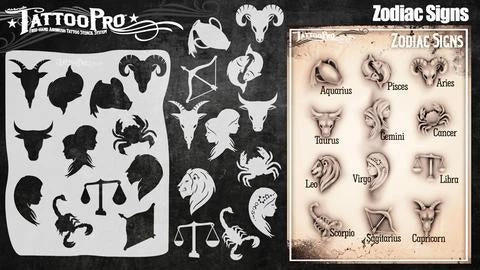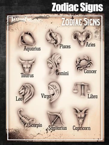 The Zodiac Signs design sheet features All 12 Mini Zodiac Signs that can be used to make realistic airbrush tattoos